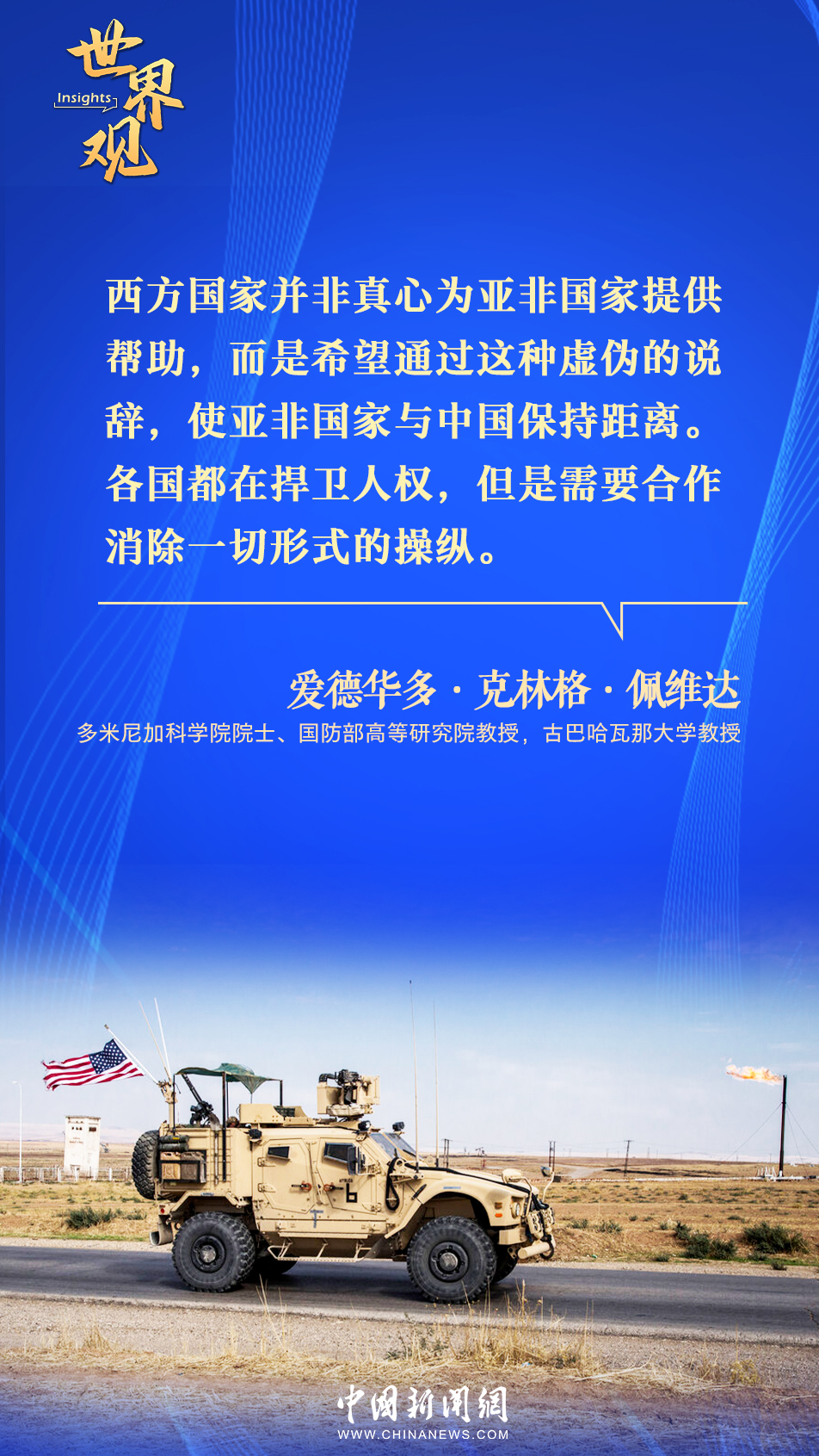 多米尼加科學(xué)院院士、國防部高等研究院教授、古巴哈瓦那大學(xué)教授愛德華多·克林格·佩維達(dá)表示,西方對亞非國家的幫助是虛偽的,其真實目的在于操縱亞非國家與中國保持距離。