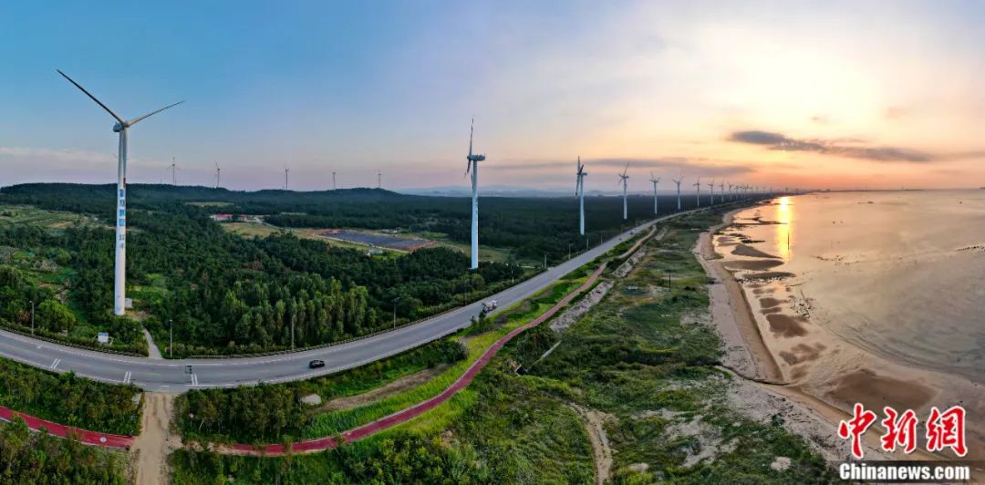 山東省榮成市北環(huán)海路,風(fēng)力發(fā)電機(jī)與沿海防護(hù)林形成一道靚麗的風(fēng)景線。近年來(lái),中國(guó)大力推廣風(fēng)電產(chǎn)業(yè)等“綠色能源”,實(shí)現(xiàn)生態(tài)保護(hù)和可持續(xù)發(fā)展。楊志禮 攝