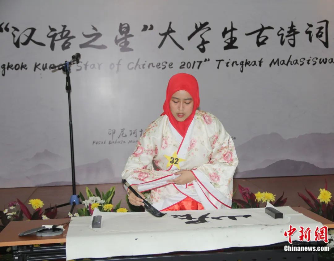 由中國孔子學(xué)院總部/國家漢辦主辦、印尼阿拉扎大學(xué)孔子學(xué)院承辦的2017“漢語之星”大學(xué)生古詩詞大賽在雅加達(dá)舉行。圖為印尼選手表演中國書法。林永傳 攝