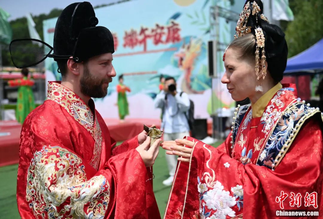2013年6月16日,一對外國夫婦品嘗粽子。當(dāng)天,一場外國友人體驗端午節(jié)習(xí)俗的活動在吉林長春舉行,近百名外國友人通過穿漢服、品嘗粽子、戴香包、投壺等“沉浸式”體驗活動,感受中國傳統(tǒng)節(jié)日的魅力。張瑤 攝