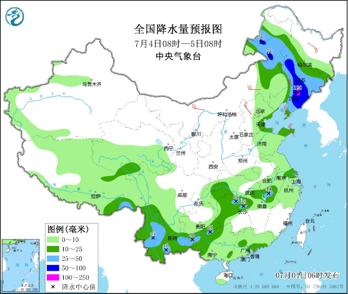 中新網(wǎng)7月4日電 據(jù)中央氣象臺網(wǎng)站消息,中央氣象臺今晨繼續(xù)發(fā)布暴雨藍(lán)色預(yù)警:預(yù)計今明兩天,東北地區(qū)及內(nèi)蒙古東北部將成強(qiáng)降雨主陣地,其中今天白天至夜間,內(nèi)蒙古東北部、黑龍江西南部、吉林、遼寧中東部等地部分地區(qū)有大到暴雨,遼寧東北部等局地有大暴雨(100~120毫米);上述部分地區(qū)伴有短時強(qiáng)降水(最大小時降雨量20~50毫米,局地可超過60毫米),局地有雷暴大風(fēng)等強(qiáng)對流天氣。明天,內(nèi)蒙古東北部、黑龍江大部、吉林北部有中到大雨,局地暴雨。受強(qiáng)降雨影響,內(nèi)蒙古東北部、東北部分地區(qū)等地有暴雨災(zāi)害中高風(fēng)險,關(guān)注局地可能發(fā)生的山洪、地質(zhì)災(zāi)害和城鄉(xiāng)積澇,并防范強(qiáng)對流天氣的危害。
