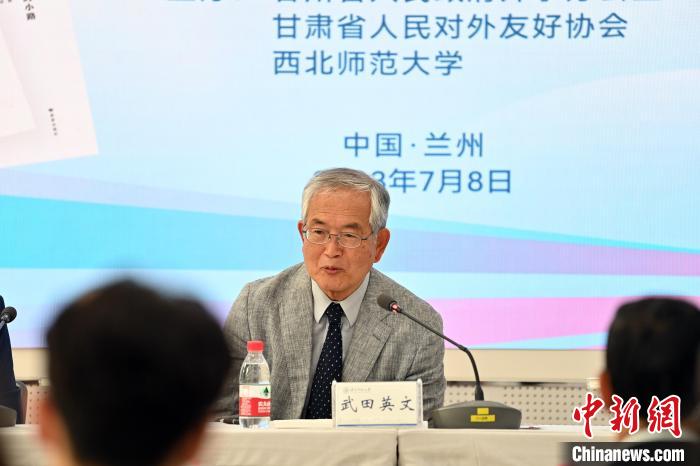 2023年7月8日,武田英文著作《通往森林的小路》中文版首發(fā)儀式在蘭州舉行。圖為武田英文與讀者分享他在甘肅的故事?!≈行律缬浾?九美旦增 攝