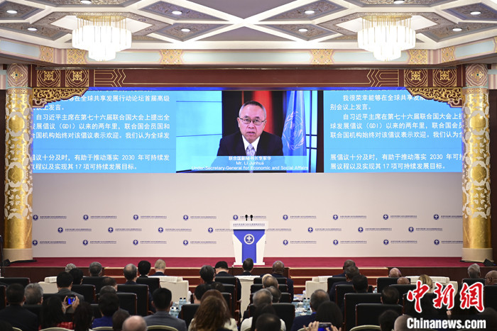 7月10日,全球共享發(fā)展行動(dòng)論壇首屆高級(jí)別會(huì)議在北京開幕。聯(lián)合國(guó)副秘書長(zhǎng)李軍華在開幕式作視頻致辭時(shí)指出,實(shí)施2030年可持續(xù)發(fā)展議程的時(shí)間框架已過半,但只有約12%的可持續(xù)發(fā)展目標(biāo)有望在2030年之前實(shí)現(xiàn),聯(lián)合國(guó)呼吁各會(huì)員國(guó)加大投入,為有需要的國(guó)家增加可負(fù)擔(dān)的長(zhǎng)期發(fā)展融資。 中新社記者 田雨昊 攝