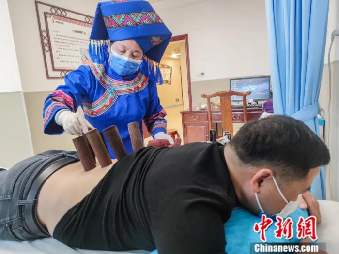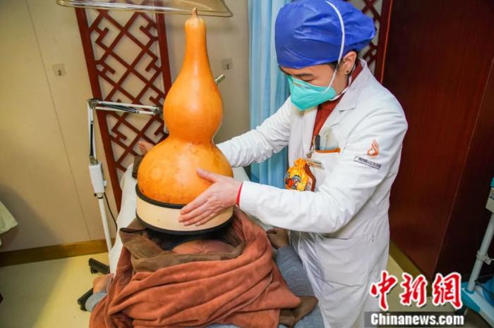南寧市廣西國(guó)際壯醫(yī)醫(yī)院民族醫(yī)療特色診療中心,壯醫(yī)醫(yī)師為進(jìn)行壯醫(yī)天陰陽(yáng)臍環(huán)穴針?lè)ㄖ委煹幕颊呱w上艾灸葫蘆。陳冠言 攝