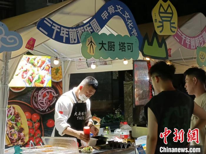 中新財(cái)經(jīng)了解到,該夜市舉辦時(shí)間為6月9日-7月9日,每天下午4點(diǎn)-晚上10點(diǎn),為沉浸式甲骨文主題夜市。盡管打著甲骨文藝術(shù)節(jié)的旗號(hào),但在涵蓋小吃、飲品、手工飾品、互動(dòng)游戲等各色賣點(diǎn)夜市上,游客們依然用行動(dòng)投票出了他們最感興趣的環(huán)節(jié)——排起長(zhǎng)隊(duì)的,無一不是特色小吃。