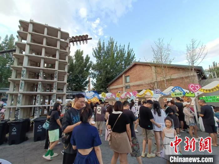 7月8日晚上8點(diǎn),盡管天色已經(jīng)暗下來,但北京的地表溫度仍在30℃以上。在798藝術(shù)區(qū)南門,一處方形場(chǎng)地被分割成幾排街道,200余家商鋪聚集在這里。在臨時(shí)搭建的白色攤位前,擠滿了游客。