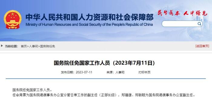 任命周霽為國(guó)務(wù)院港澳事務(wù)辦公室分管日常工作的副主任(正部長(zhǎng)級(jí)),鄭雁雄、鄭新聰為國(guó)務(wù)院港澳事務(wù)辦公室副主任。
