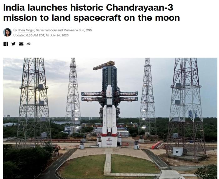 中新網(wǎng)7月14日電 據(jù)美國(guó)有線電視新聞網(wǎng)(CNN)報(bào)道,當(dāng)?shù)貢r(shí)間14日下午,印度“月船3號(hào)”月球探測(cè)器發(fā)射升空。報(bào)道稱(chēng),如果該月球探測(cè)器8月著陸成功,印度將成為第4個(gè)在月球表面軟著陸的國(guó)家。