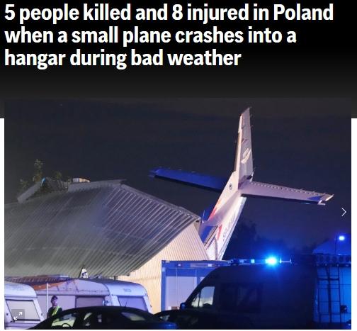 據(jù)報道,當天,波蘭國家消防局發(fā)言人莫妮卡·諾瓦科斯卡·布林達(Monika Nowakowska-Brynda)表示,“波蘭中部的克辛諾(Chrcynno)地區(qū),受惡劣天氣影響,一架塞斯納型飛機在降落時墜入跳傘中心的機庫,事發(fā)時有10人在機庫中,飛行員和在機庫中躲避暴風雨天氣的4名人員遇難。”