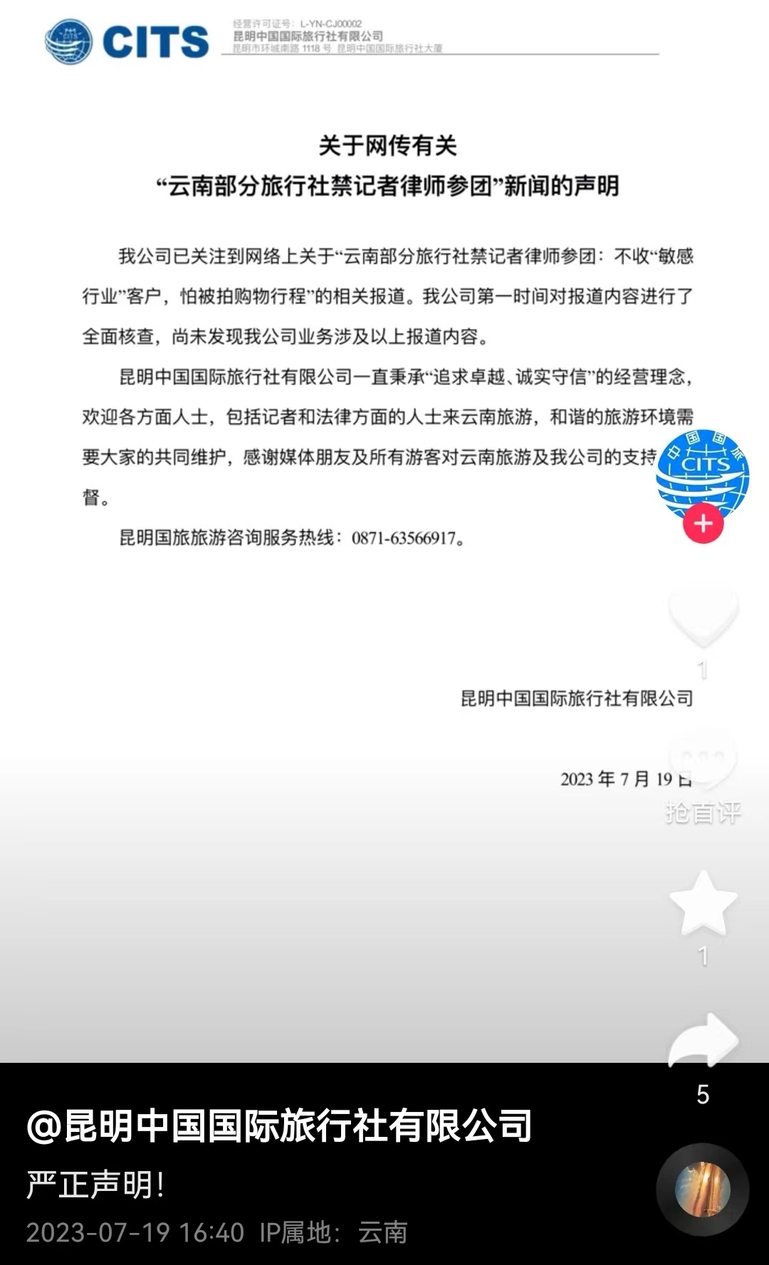 昆明中國(guó)國(guó)際旅行社在抖音上發(fā)布聲明。