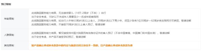 某云南跟團(tuán)游產(chǎn)品預(yù)訂限制。 截圖自某在線旅游服務(wù)平臺(tái)。