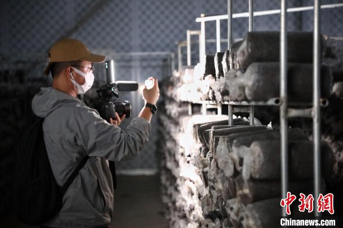7月17日,甘肅省古浪縣,參加“絲路風(fēng)采 如意甘肅”聯(lián)合采訪活動(dòng)的兩岸及香港記者在當(dāng)?shù)仞B(yǎng)菌出菇的冷庫內(nèi)采訪拍攝?!≈行律缬浾?李雪峰 攝