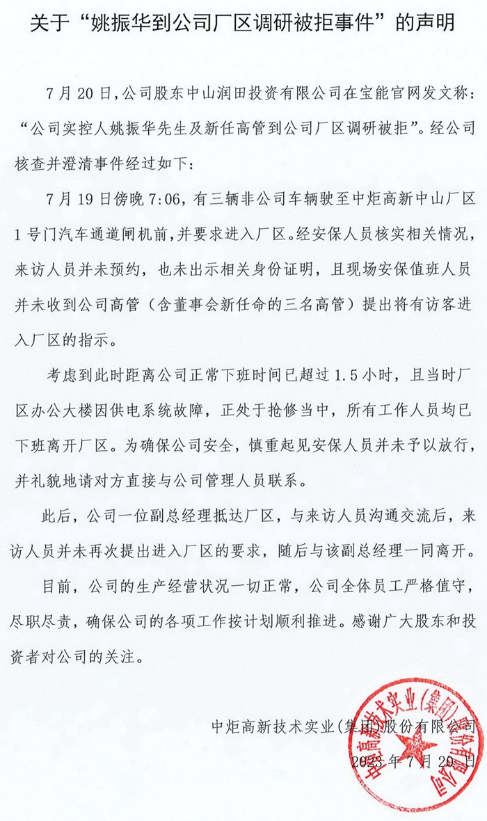 近日,“寶能系”股東中山潤田在寶能集團官網(wǎng)發(fā)布聲明稱,寶能集團董事長姚振華得知中炬高新日常管理工作出現(xiàn)重大紕漏的相關(guān)情況后,非常擔(dān)憂上市公司的生產(chǎn)安全及食品安全問題,趕往中山中炬高新總部,調(diào)研生產(chǎn)經(jīng)營情況。未曾想,竟被保安拒絕進入。