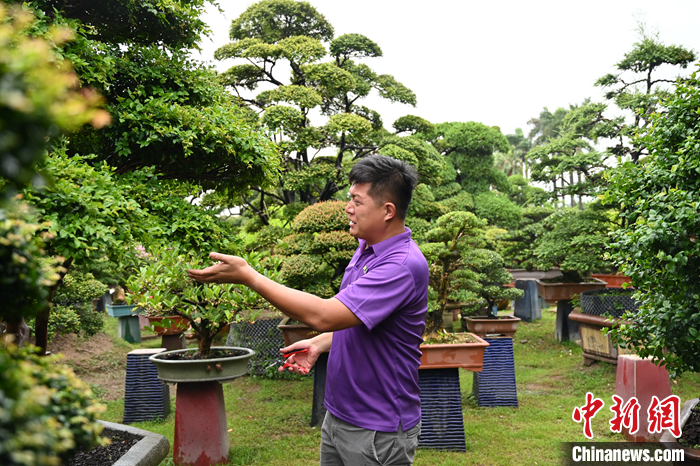 圖為7月18日,廣東佛山,王俞又在嘉盛園藝總場(chǎng)介紹盆景養(yǎng)護(hù)技巧。 中新社記者 陳楚紅 攝