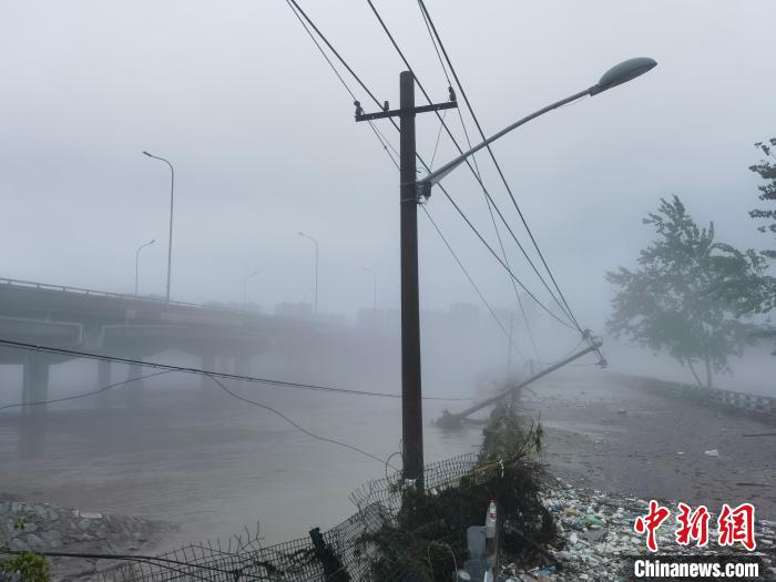 8月1日下午,在永定河京原漫水橋現(xiàn)場,武警北京總隊(duì)機(jī)動(dòng)第三支隊(duì)200名官兵正在此處實(shí)施封堵作業(yè),以防止洪水漫溢,影響周邊百姓。圖為京原漫水橋上的一根電線桿已被洪流沖歪,各種雜物散落各處。中新社記者 劉亮 攝