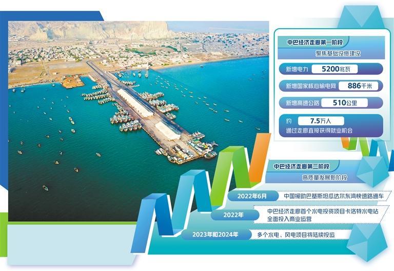 當(dāng)前正處于中巴經(jīng)濟走廊建設(shè)的第二階段,這也是至關(guān)重要的高質(zhì)量發(fā)展新階段。中巴雙方在走廊框架下,進(jìn)一步加強巴國工業(yè)化進(jìn)程、人力資源培訓(xùn)和產(chǎn)業(yè)園區(qū)建設(shè),在扶貧、醫(yī)療、農(nóng)業(yè)以及互聯(lián)網(wǎng)等眾多與民生息息相關(guān)的領(lǐng)域持續(xù)深化合作,力求創(chuàng)造更多就業(yè)機會,不斷推動巴基斯坦的經(jīng)濟和社會現(xiàn)代化發(fā)展,造福當(dāng)?shù)孛癖姟?022年6月,中國援助巴基斯坦瓜達(dá)爾東灣快速路通車,打通了瓜達(dá)爾港和卡拉奇之間的交通運輸通道。同年,中巴經(jīng)濟走廊首個水電投資項目——卡洛特水電站全面投入商業(yè)運營,每年將向巴基斯坦提供32億千瓦時廉價清潔電能,滿足當(dāng)?shù)?00萬人用電需求,每年可節(jié)約標(biāo)準(zhǔn)煤約140萬噸,減少二氧化碳排放350萬噸。今明兩年,走廊框架下的多個水電、風(fēng)電項目將陸續(xù)投運,未來巴基斯坦在清潔能源領(lǐng)域大有可為。