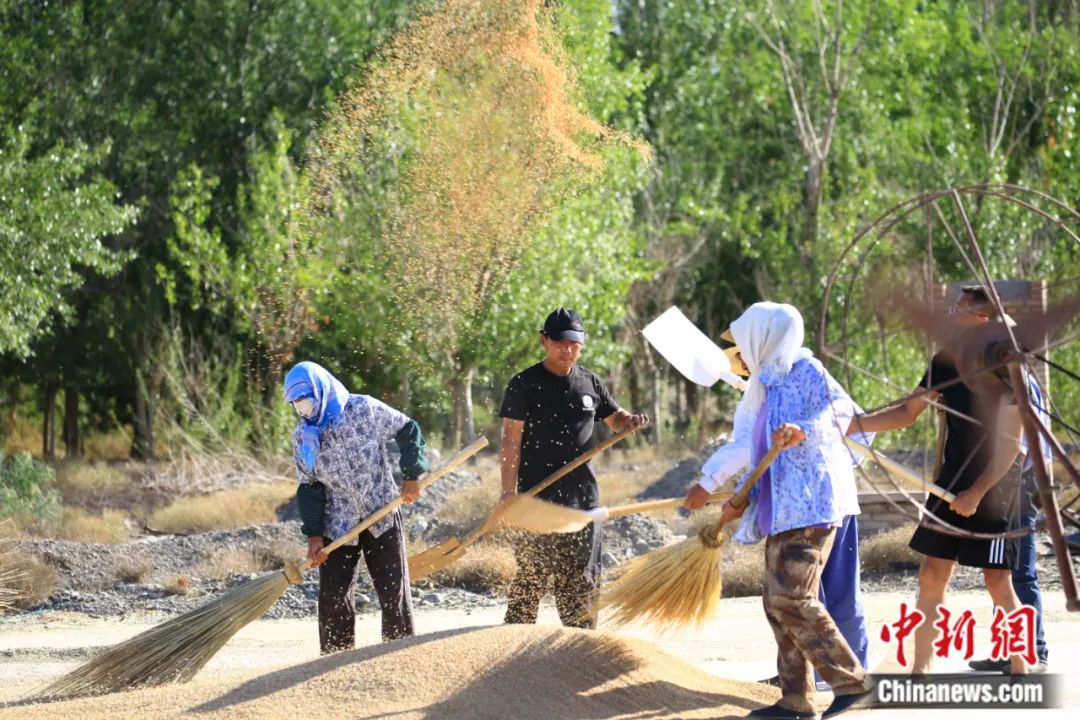 2023年7月23日,甘肅省嘉峪關(guān)市文殊鎮(zhèn)3000余畝小麥喜獲豐收,農(nóng)民搶抓晴好天氣揚(yáng)場(chǎng)晾曬小麥,確保顆粒歸倉。馬玉福 攝