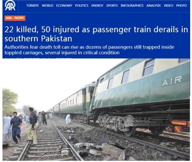 據(jù)報(bào)道,一名巴基斯坦南部信德省官員稱,當(dāng)天,從卡拉奇開(kāi)往哈維連的一列客運(yùn)火車在信德省桑克爾地區(qū)附近脫軌,有至少10節(jié)車廂沖出軌道。
