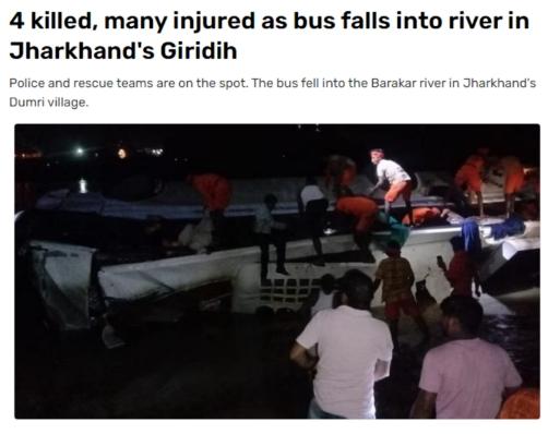 據(jù)報(bào)道,當(dāng)?shù)鼐椒Q(chēng),當(dāng)晚約20:40,在賈坎德邦(Jharkhand)的吉里迪(Giridih)縣,一輛從蘭契開(kāi)往吉里迪的大巴車(chē)突然撞壞大橋欄桿,隨后墜入河流,橋梁高度約15米,造成至少4人死亡。預(yù)計(jì)還有幾人溺水身亡,救援行動(dòng)正在進(jìn)行中。