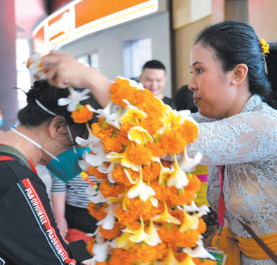 在印度尼西亞巴厘島伍拉萊國(guó)際機(jī)場(chǎng),工作人員為中國(guó)游客佩戴迎賓花環(huán)。
