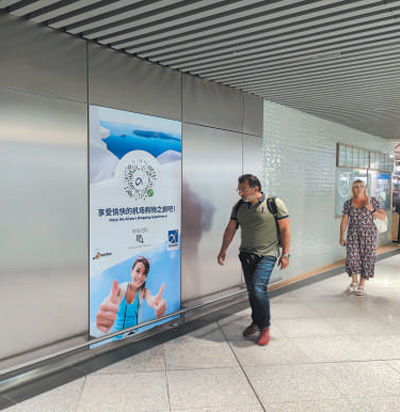 希臘雅典國(guó)際機(jī)場(chǎng)內(nèi),旅客走過(guò)用中文書(shū)寫(xiě)的廣告海報(bào)。