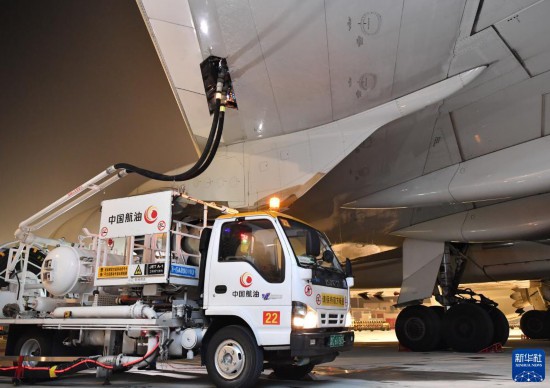 8月1日,在中國鄭州新鄭國際機(jī)場(chǎng),中國航油華南藍(lán)天河南分公司的工作人員為一架盧森堡貨航貨機(jī)加油。新華社記者 李嘉南 攝