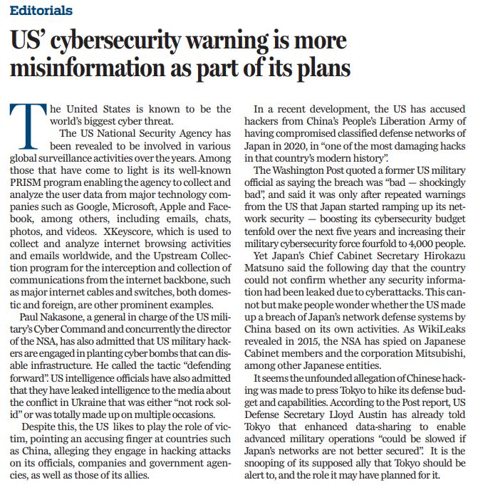 盡管如此,美國卻總是裝出一副受害者的樣子,指責(zé)中國等國對美國及其盟友的官員、企業(yè)和政府機(jī)構(gòu)發(fā)動黑客攻擊。最近,美國就指責(zé)中國黑客在2020年入侵了日本防衛(wèi)部門的機(jī)密網(wǎng)絡(luò),稱之為“日本現(xiàn)代史上最具破壞性的黑客攻擊之一”。然而,日本內(nèi)閣官房長官松野博一表示,日本無法確認(rèn)是否有任何安全信息因網(wǎng)絡(luò)攻擊而泄露。這不禁讓人懷疑,美國是否根據(jù)自己的黑客活動,編造了中國破壞日本網(wǎng)絡(luò)防御系統(tǒng)的故事?維基解密在2015年就披露,美國國家安全局在秘密監(jiān)視日本內(nèi)閣成員和三菱公司,以及其他日本實(shí)體。