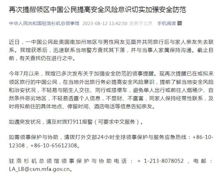 中新網(wǎng)8月12日電 據(jù)中國駐洛杉磯總領(lǐng)事館官方公眾號(hào)12日消息,近日,一中國公民赴美國南加州地區(qū)與男性網(wǎng)友見面并共同旅行后與家人親友失去聯(lián)系。中國駐洛杉磯總領(lǐng)事館獲悉后,迅速聯(lián)系當(dāng)?shù)鼐讲檎移湎侣?,并與當(dāng)事人家屬保持溝通。截至目前,有關(guān)查找仍在進(jìn)行之中。