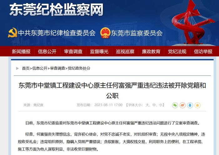 按照東莞市紀(jì)委監(jiān)委的通報(bào),何富強(qiáng)喪失理想信念,背棄初心使命,對(duì)黨不忠誠(chéng)不老實(shí),對(duì)抗組織審查;無(wú)視中央八項(xiàng)規(guī)定精神,違規(guī)收受禮金;違背組織原則,隱瞞入黨前嚴(yán)重錯(cuò)誤;貪欲膨脹,大搞權(quán)錢(qián)交易,利用職務(wù)上的便利,在工程承攬、施工等方面為他人謀取利益,非法收受巨額財(cái)物。