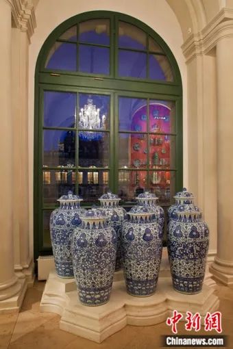 中國(guó)清朝時(shí)期的釉下藍(lán)色紀(jì)念性花瓶,即南部拱形長(zhǎng)廊中的所謂龍騎兵花瓶。版權(quán)所有:德累斯頓國(guó)家藝術(shù)收藏館瓷器館藏。照片:Jürgen Lsel