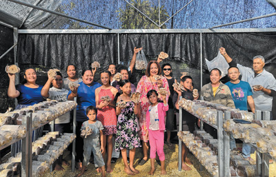 湯加示范戶阿拉尼一家在中國(guó)援助的食用菌大棚里采摘豐收的食用菌。