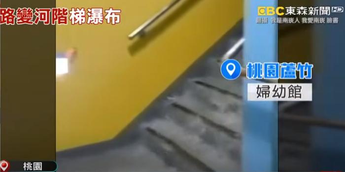 圖為臺灣桃園市蘆竹區(qū)婦女館的樓梯出現(xiàn)“小瀑布”。 圖片來源:臺灣東森新聞網視頻截圖