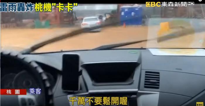 圖為臺灣桃園機場乘客涉水開車通過積水路面。圖片來源:臺灣東森新聞網視頻截圖