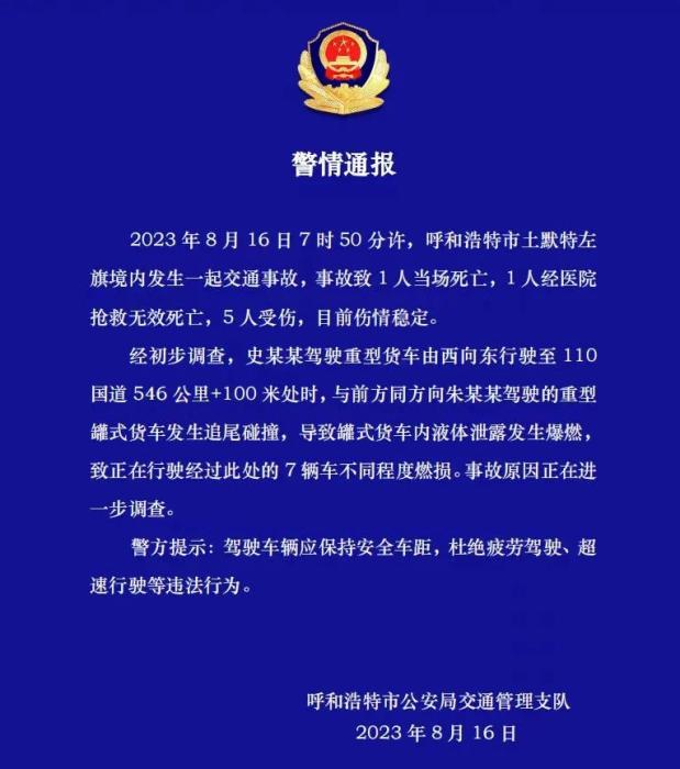 經(jīng)初步調(diào)查,史某某駕駛重型貨車由西向東行駛至110國道546公里+100米處時(shí),與前方同方向朱某某駕駛的重型罐式貨車發(fā)生追尾碰撞,導(dǎo)致罐式貨車內(nèi)液體泄露發(fā)生爆燃,致正在行駛經(jīng)過此處的7輛車不同程度燃損。事故原因正在進(jìn)一步調(diào)查。
