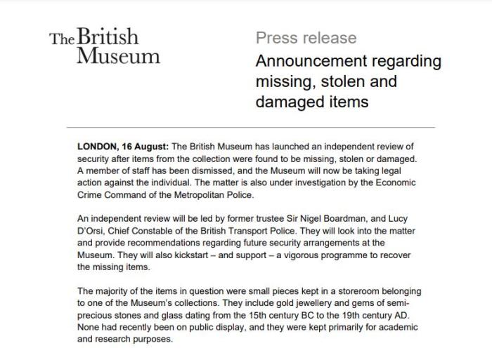 大英博物館表示,在發(fā)現(xiàn)博物館藏品“丟失、被盜或損壞”后啟動了獨立的安全審查,一名員工已經(jīng)被解雇,博物館將對該員工采取法律行動。