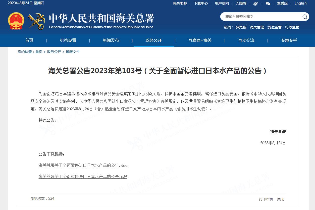 中新網(wǎng)8月24日電 據(jù)海關(guān)總署網(wǎng)站消息,為全面防范日本福島核污染水排海對食品安全造成的放射性污染風險,保護中國消費者健康,確保進口食品安全,依據(jù)《中華人民共和國食品安全法》及其實施條例、《中華人民共和國進出口食品安全管理辦法》有關(guān)規(guī)定,以及世界貿(mào)易組織《實施衛(wèi)生與植物衛(wèi)生措施協(xié)定》有關(guān)規(guī)定,海關(guān)總署決定自2023年8月24日(含)起全面暫停進口原產(chǎn)地為日本的水產(chǎn)品(含食用水生動物)。