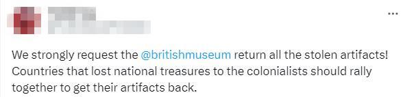 不少網(wǎng)友也在社交媒體上發(fā)文,要求大英博物館采取行動。有人表示,“大英博物館什么時候能歸還他們從埃及、印度和伊朗偷來的東西?我可以列出更多受害國家……”