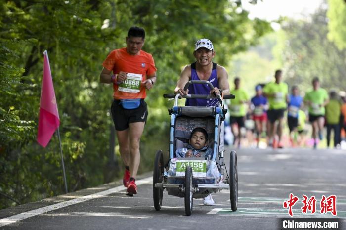 浙江金華婺城人羅書堅(jiān)(右)推著兒子跑馬拉松(資料圖)。胡肖飛攝