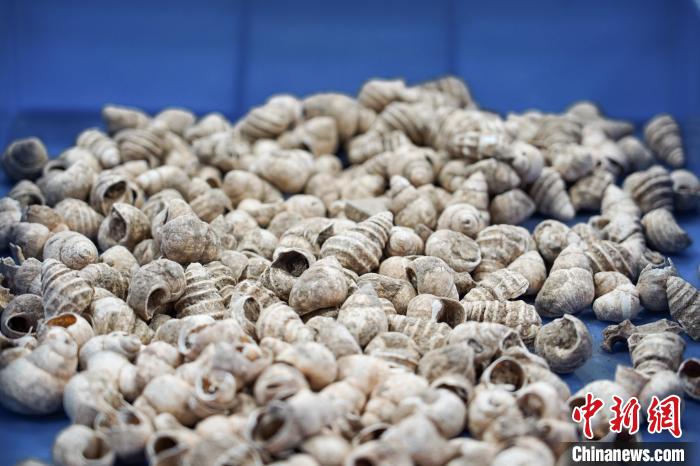 圖為柳州白蓮洞穴科學(xué)博物館庫房內(nèi)的螺螄殼化石。韋國政 攝