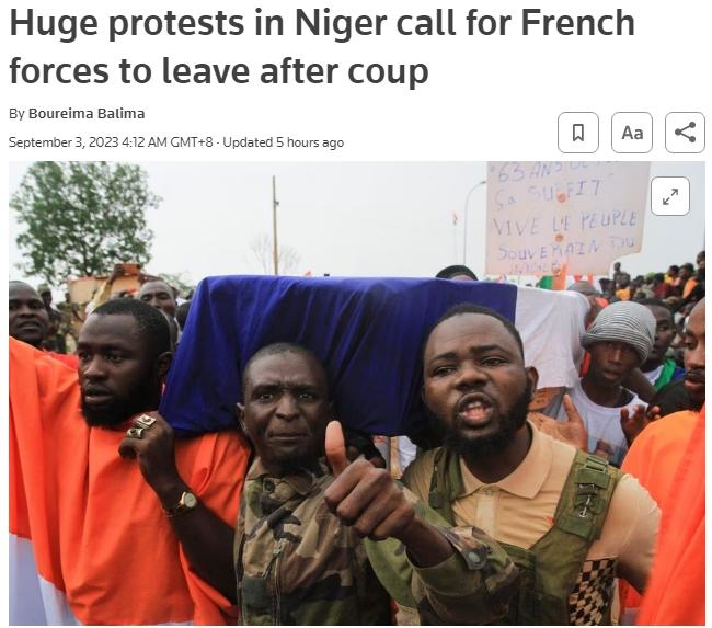 據(jù)報(bào)道,美國、法國、德國和意大利軍隊(duì)駐扎在尼日爾,以打擊“基地”組織和“伊斯蘭國”組織在當(dāng)?shù)氐姆种А7▏谀崛諣柌渴鹩?500名官兵。尼日爾軍政權(quán)8月3日宣布廢除尼法兩國一切軍事合作協(xié)定,并要求法國駐尼日爾軍隊(duì)最晚于9月3日撤離尼日爾,但遭到法國外交部拒絕。
