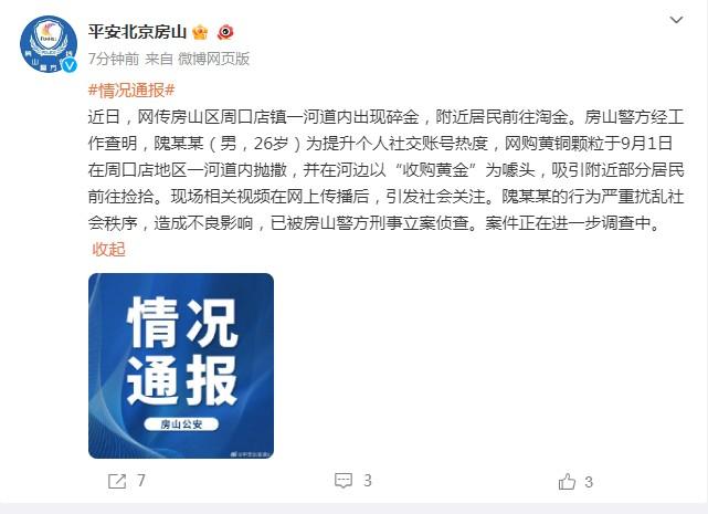 北京房山區(qū)一河道內(nèi)出現(xiàn)碎金?警方通報(bào)