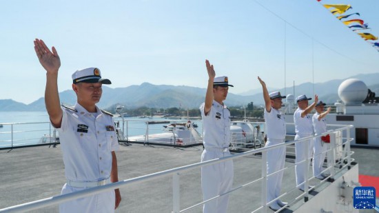9月3日,中國(guó)海軍“和平方舟”號(hào)醫(yī)院船抵達(dá)東帝汶帝力港,任務(wù)官兵向迎接人群揮手致意。新華社發(fā)(徐巍 攝)