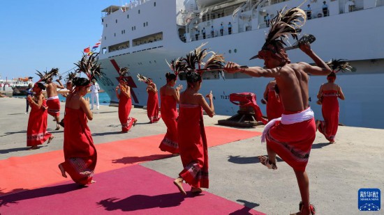 9月3日,中國(guó)海軍“和平方舟”號(hào)醫(yī)院船抵達(dá)東帝汶帝力港,當(dāng)?shù)孛癖姳硌萏厣栉铓g迎。新華社發(fā)(徐巍 攝)