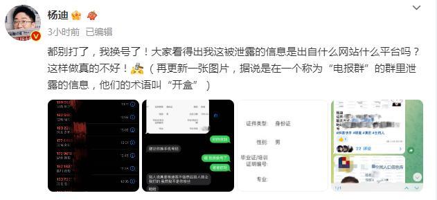 中新網(wǎng)北京9月4日電 今天,#楊迪信息被泄露#登上熱搜。從楊迪在微博上曬出的圖可以看到,他的電話已經(jīng)被打爆,無奈之下只能換手機號。