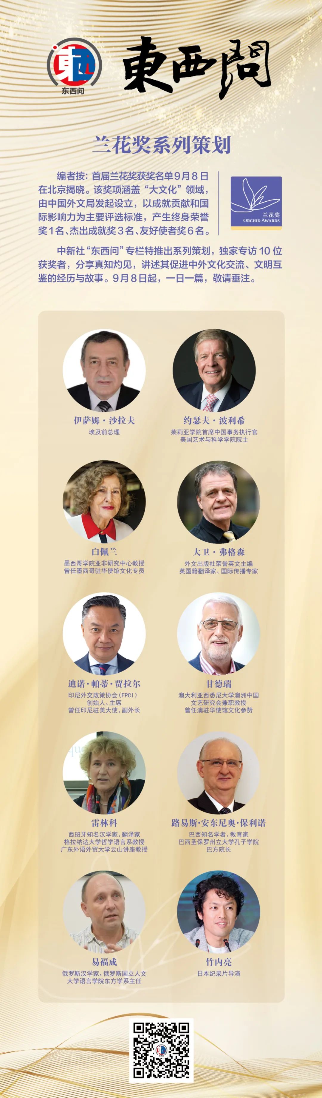 中新社“東西問(wèn)”專(zhuān)欄特推出系列策劃,獨(dú)家專(zhuān)訪(fǎng)10位獲獎(jiǎng)?wù)撸窒碚嬷埔?jiàn),講述其促進(jìn)中外文化交流、文明互鑒的經(jīng)歷與故事。9月8日起,一日一篇,敬請(qǐng)垂注。