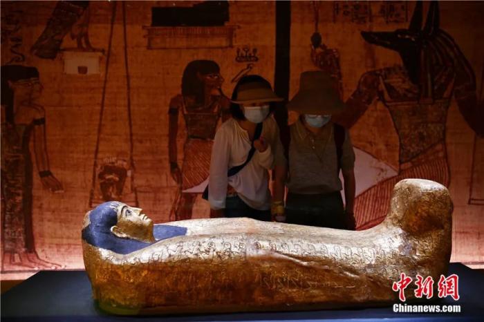 2022年8月18日,“遇見(jiàn)古埃及-木乃伊大型文物特展”在遇見(jiàn)博物館·成都館開(kāi)展,全身鍍金木乃伊棺槨吸引參觀(guān)者。攝