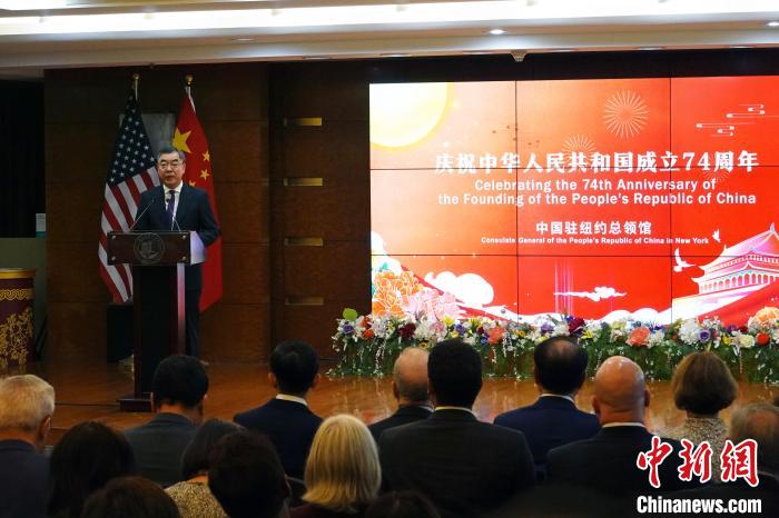 中國駐紐約總領(lǐng)事黃屏在講話中表示,74年來,中國大地發(fā)生了翻天覆地的變化,創(chuàng)造了世所罕見的經(jīng)濟快速發(fā)展和社會長期穩(wěn)定兩大奇跡。今年是改革開放45周年。改革開放不僅深刻改變了中國,也深刻影響了世界。當(dāng)前中國已邁入新時代。新起點上的中國,將繼續(xù)以高質(zhì)量發(fā)展和高水平開放給各國提供新的機遇,給變亂交織的世界注入寶貴的信心和力量。