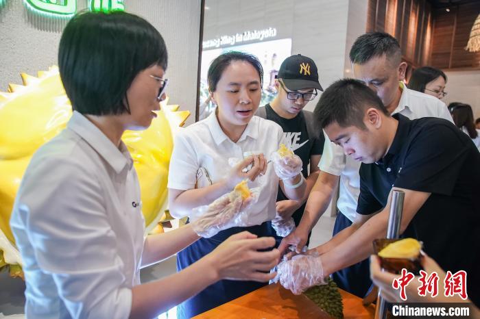 9月14日,廣西南寧消費(fèi)者搶“鮮”品嘗產(chǎn)自馬來西亞“貓山王之鄉(xiāng)”——彭亨州勞勿縣的榴蓮。 中新社記者 陳冠言 攝