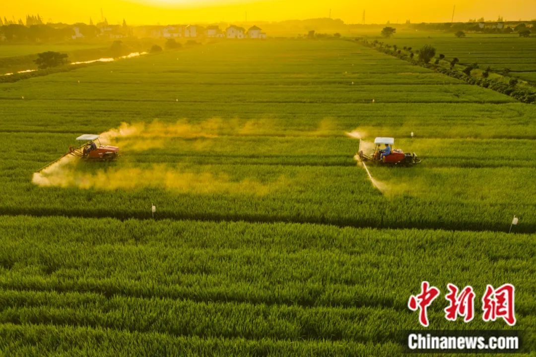 江蘇省昆山市三聯(lián)村雙婁里稻田,農(nóng)民駕駛植保機(jī)為水稻噴農(nóng)藥。袁新宇 攝