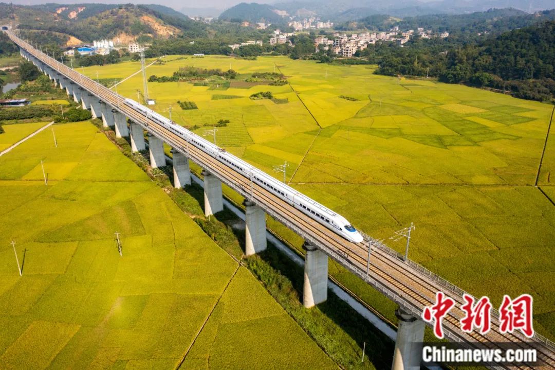 廣西梧州市龍圩區(qū)大坡鎮(zhèn)河步村,一列動(dòng)車穿行于金色稻田。何華文 攝